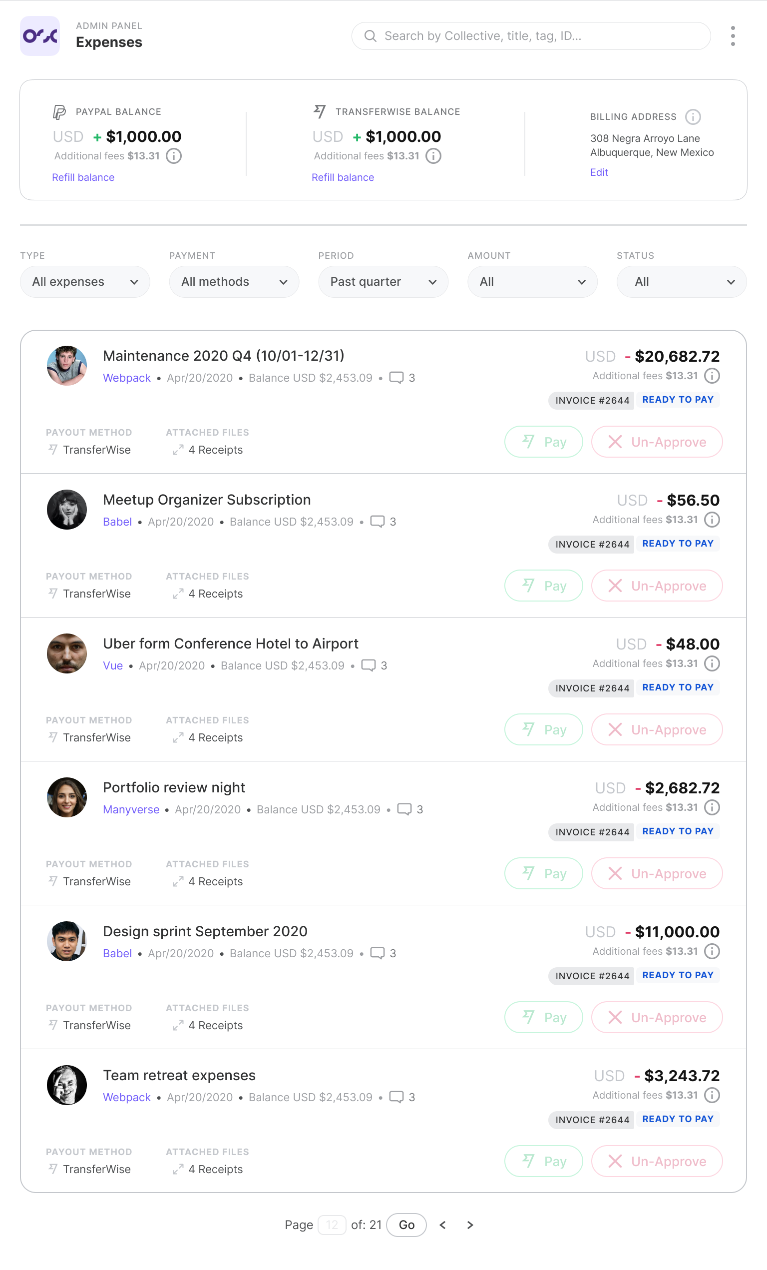 To withdraw funds, payees submit expenses through the platform, with associated invoices and receipts. Easily view and approve expenses through your admin dashboard—payment via bank transfer or Paypal is built-in, so you can pay in a single click.